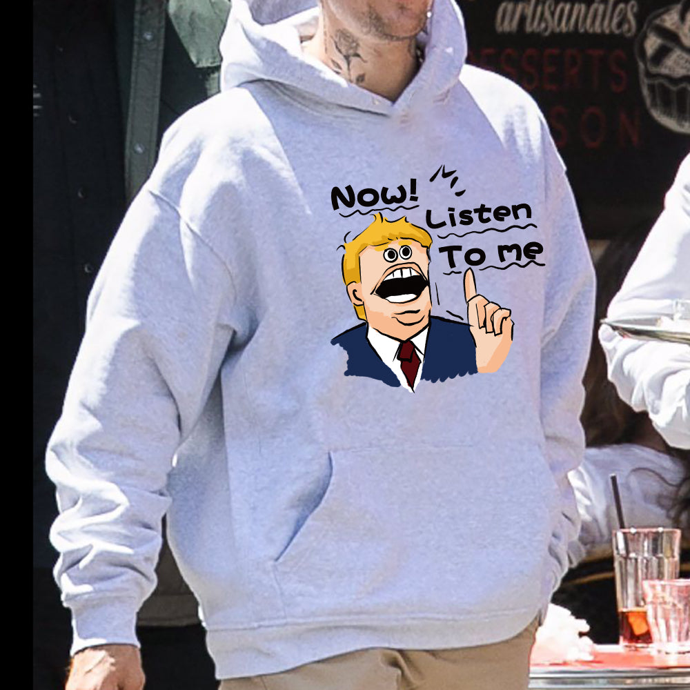Do you enjoy trendy prints that reflect current affairs? If so, you'll love our new design theme featuring a range of iconic figures and classic phrases. These prints will be presented in adorable illustrations, adding a touch of charm to your wardrobe. If you're interested, show your support and grab one today! Look no further! Our newest designs feature iconic quotes from the former US President Donald Trump. Now, listen to me: If you're a fan of Trump or simply appreciate his charismatic persona, these hoodies are a must-have addition to your wardrobe. Show your support and make a statement with our collection of men's hoodies. Order yours today!